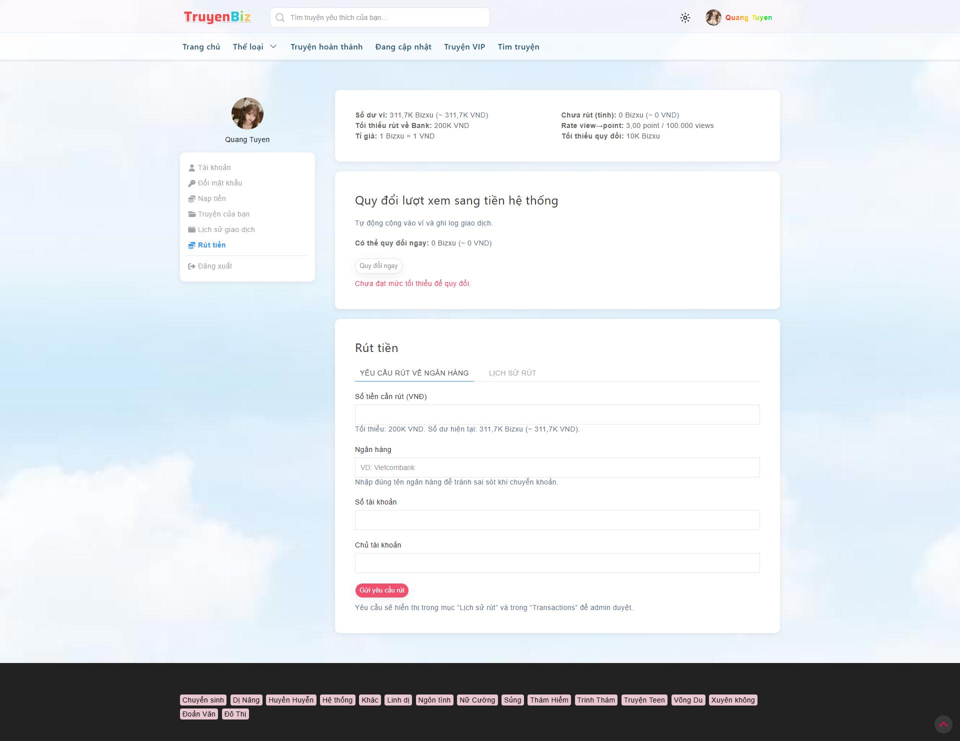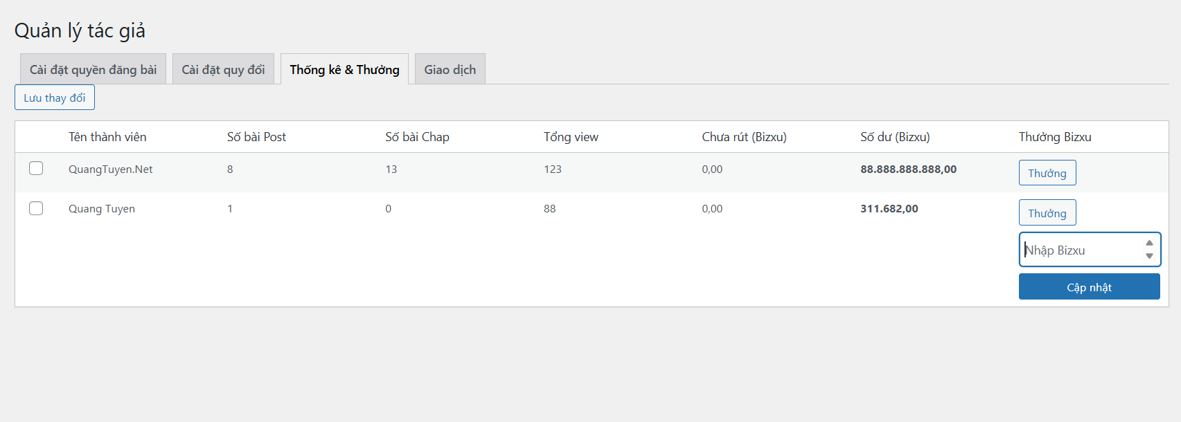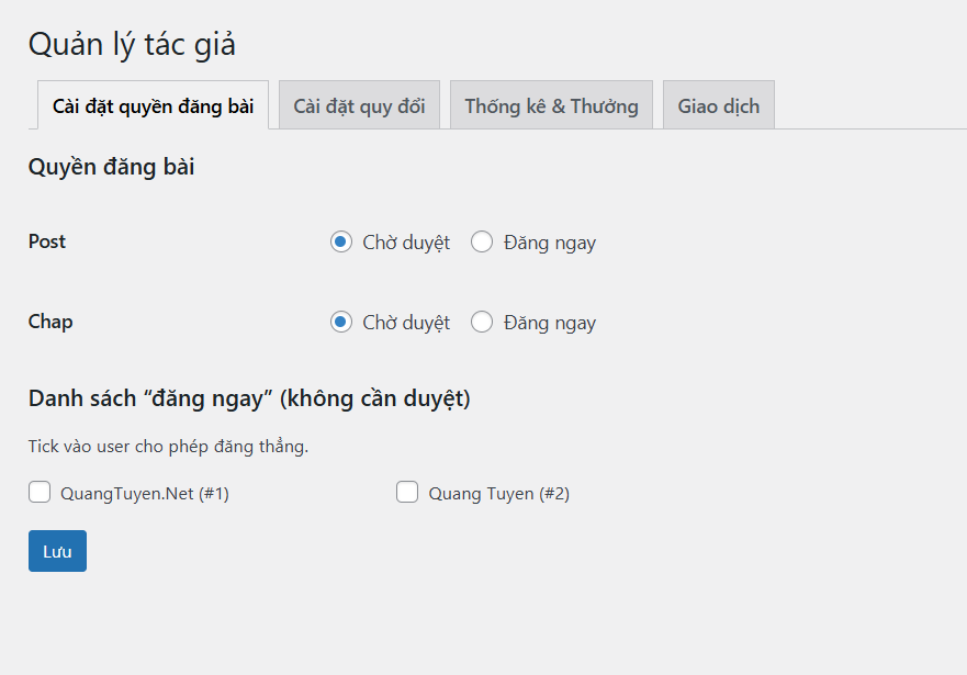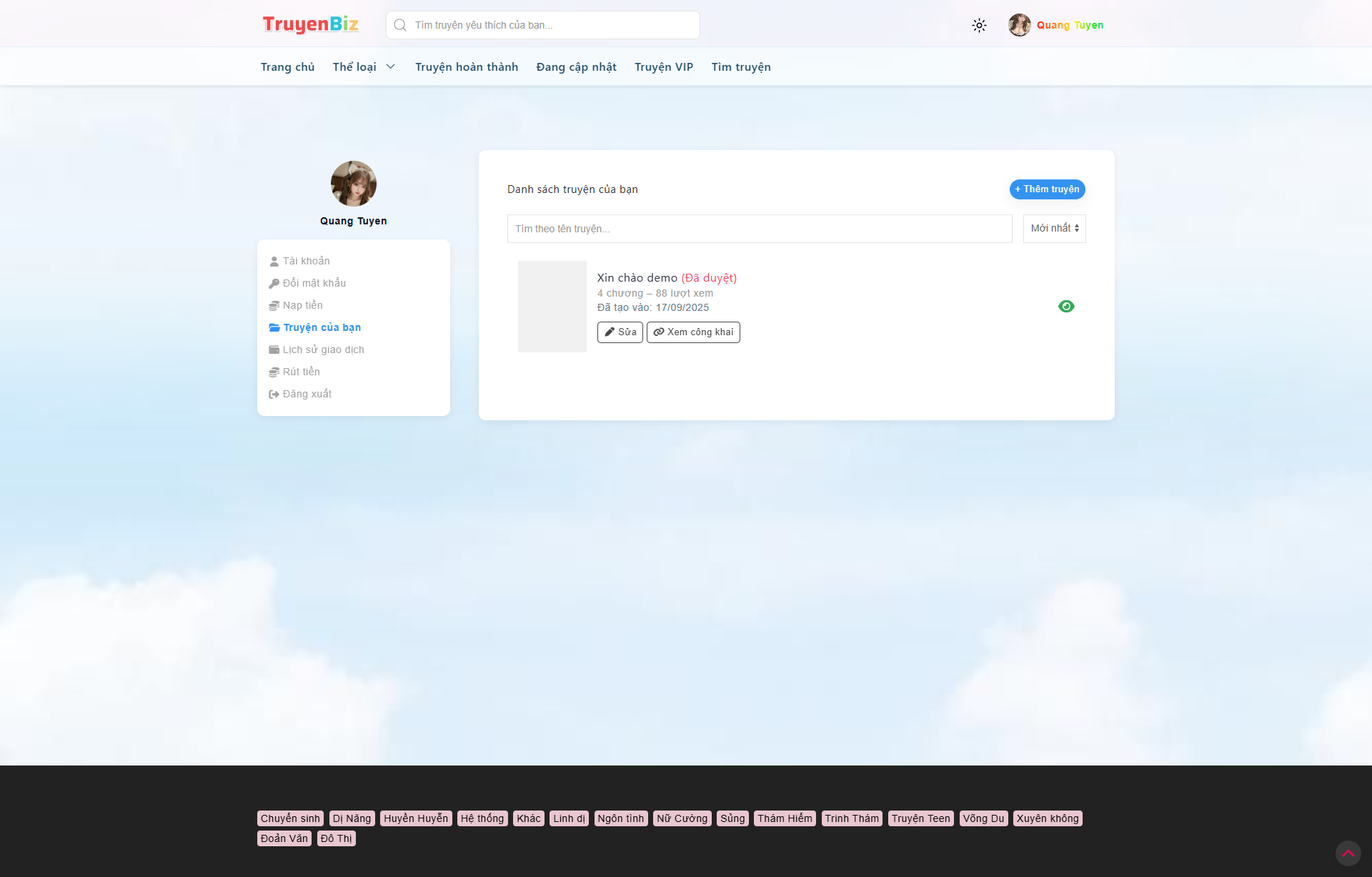 Cho phép các thành viên đăng ký làm tác giả, đăng truyện lên website của bạn. Có các chức năng cơ bản: Duyệt truyện, quy đổi lượt xem ra tiền, yêu cầu rút tiền trong tài khoản….
