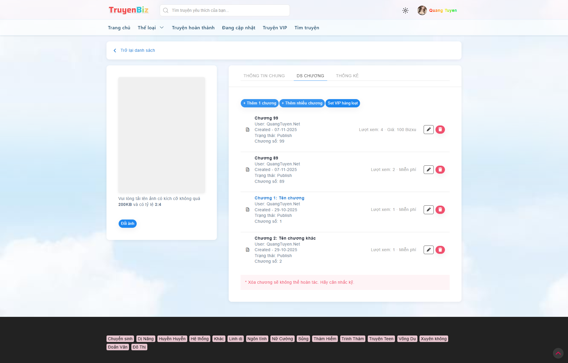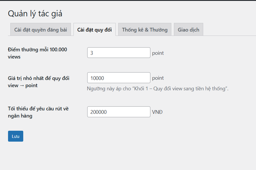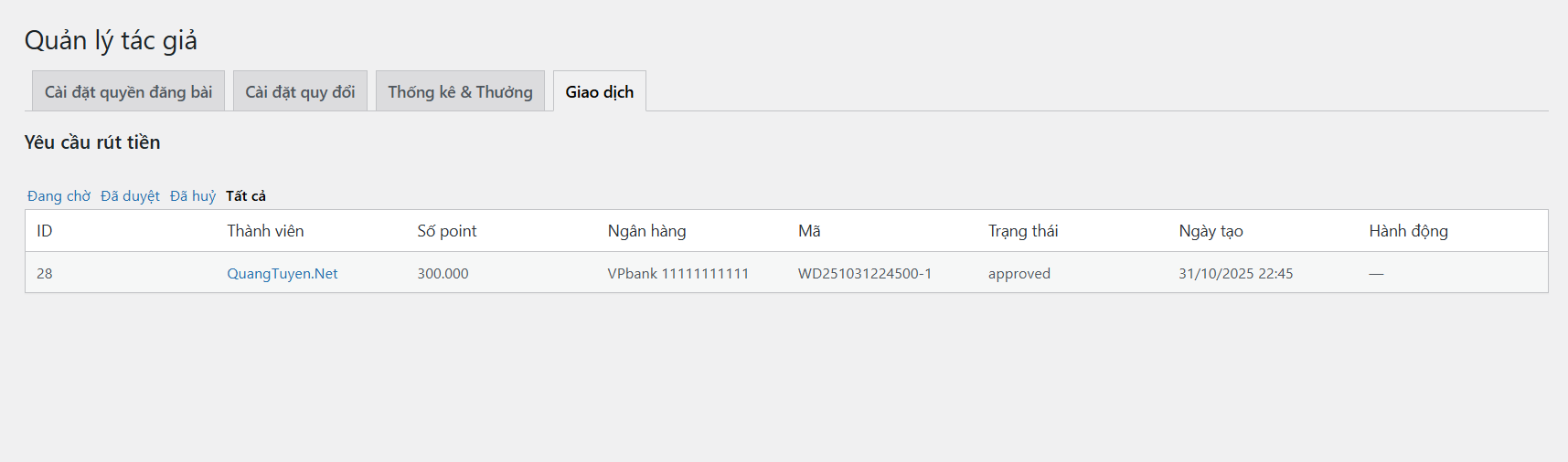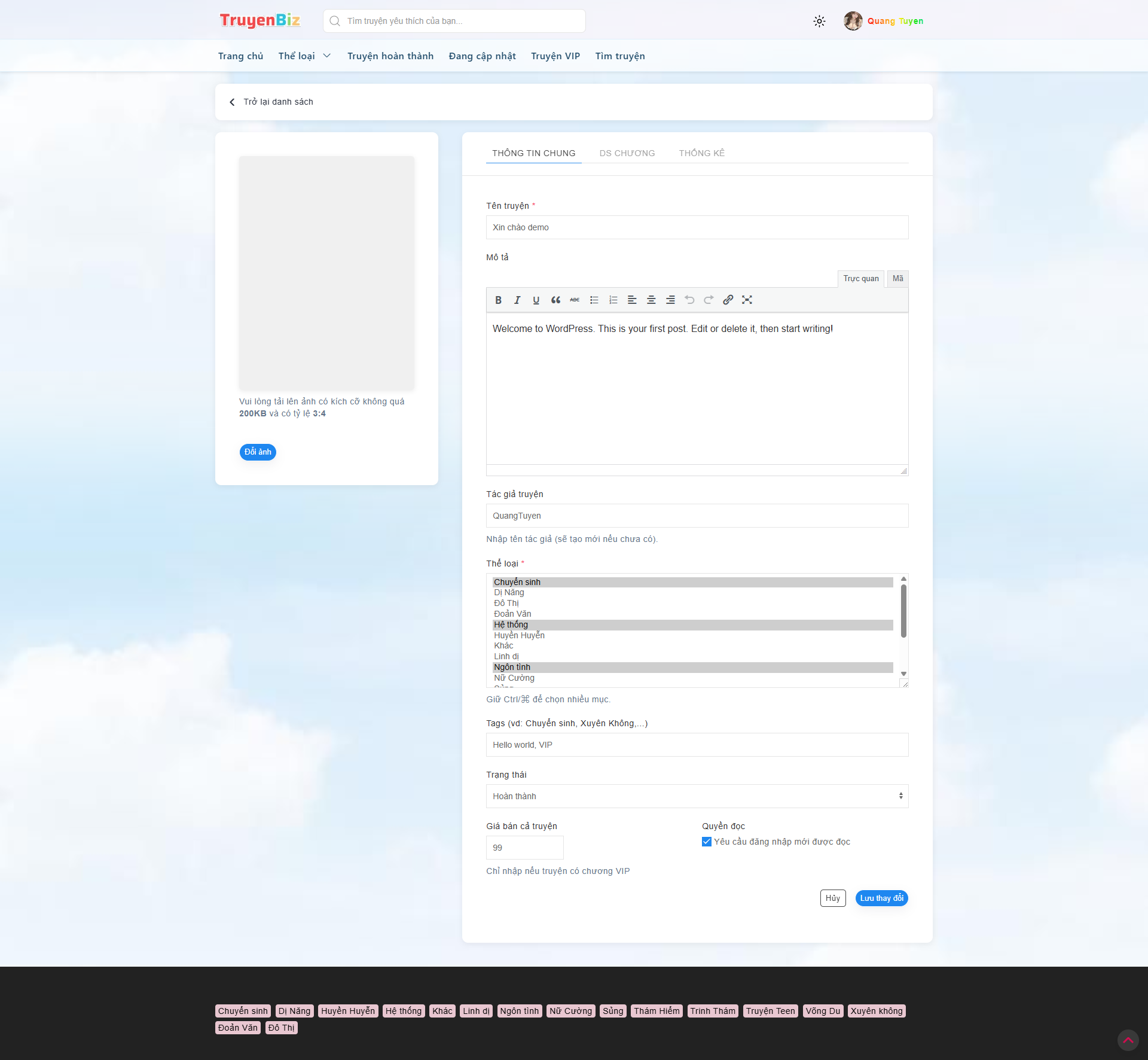 Cho phép các thành viên đăng ký làm tác giả, đăng truyện lên website của bạn. Có các chức năng cơ bản: Duyệt truyện, quy đổi lượt xem ra tiền, yêu cầu rút tiền trong tài khoản….